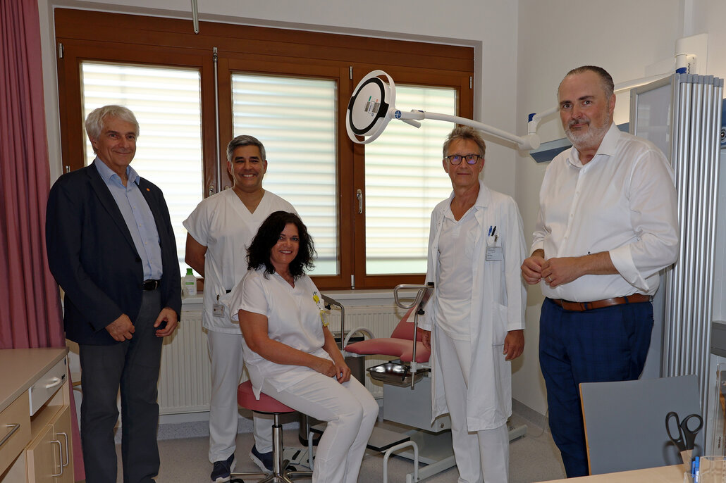 Bildtext Institut Kinderwunsch: Im Sommer 2024 wurden die Räumlichkeiten des Instituts Kinderwunsch Burgenland in der Klinik Oberpullendorf erweitert. Im Bild v.l.: Univ.-Prof. Dr. Stephan Kriwanek (MedizinischerGeschäftsführer Gesundheit Burgenland), Prof. Dr. Kazem Nouri (Leiter Institut Kinderwunsch Burgenland), DGKP Dagmar Czmaidalka (Ambulanzleitung), OA Dr. Peter Bauer (Co-Leiter Institut Kinderwunsch Burgenland) und Landeshauptmann Mag. Hans Peter Doskozil.