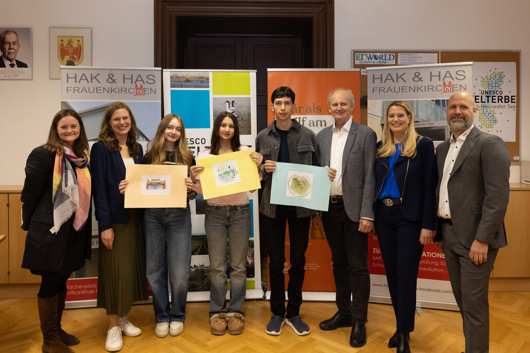 Bildtext Jubiläumslogo Welterbe Neusiedler See_1: Landeshauptmann-Stellvertreterin Anja Haider-Wallner (2.v.l.), Landesrätin Daniela Winkler (2.v.r.), Obmann Erwin Preiner (3.v.r.), Direktor Hannes Schmid (HAK-HAS Frauenkirchen) und Geschäftsführerin Linda Karner (l., Verein Welterbe Neusiedler See) mit den Preisträgerinnen und dem Preisträger Laura Lentsch (2. Patz), Nora Tatai (Gewinnerin) und Felix Peck (v.l., 3. Platz) bei der Präsentation des Jubiläumslogos für das Welterbe Neusiedler See.