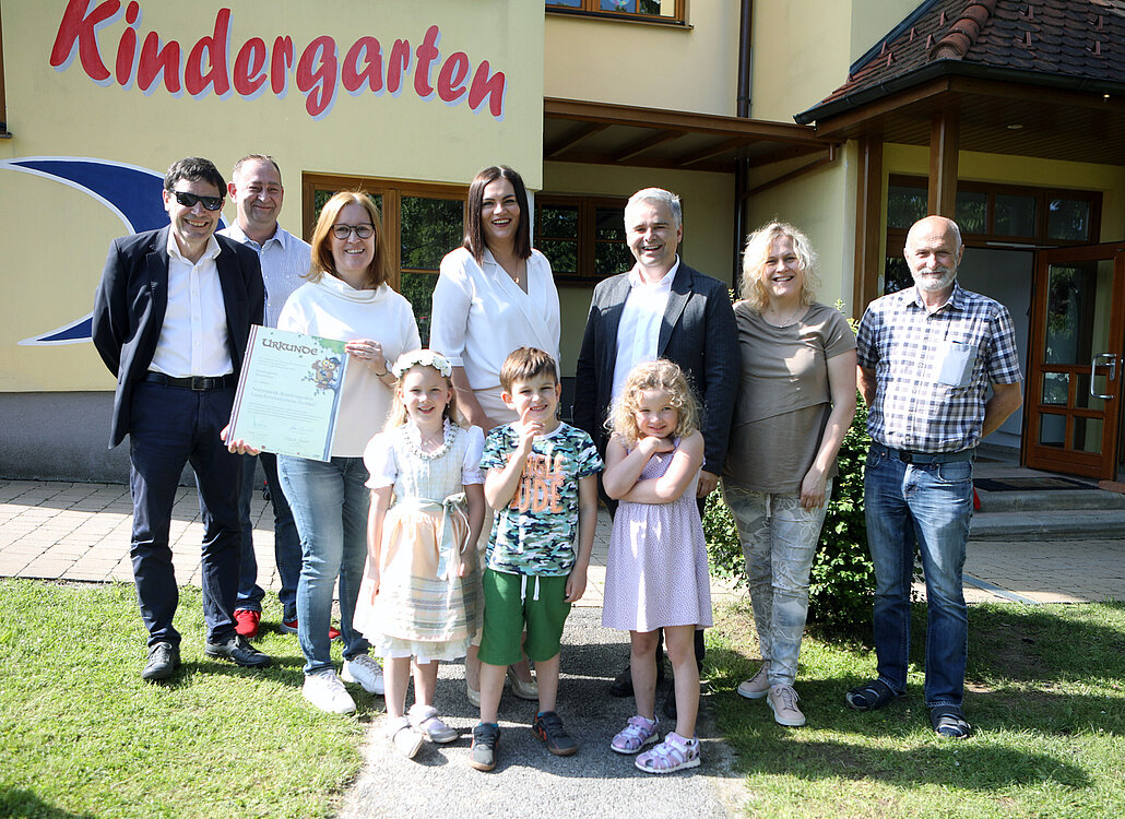 Bildtext Zertifizierung-Naturpark-Kindergarten Holzschlag1: Landeshauptmann-Stv. Mag.a Astrid Eisenkopf (4.v.l. hinten) überreichte gemeinsam mit Geschäftsführer Franz Handler (l.) vom Verband der Naturparke Österreichs und Bürgermeister Christian Pinzker (3.v.r. stehend) die Naturpark-Kindergarten-Urkunde an Holzschlags Kindergarten-Leiterin Katharina Schranz (3.v.l.).