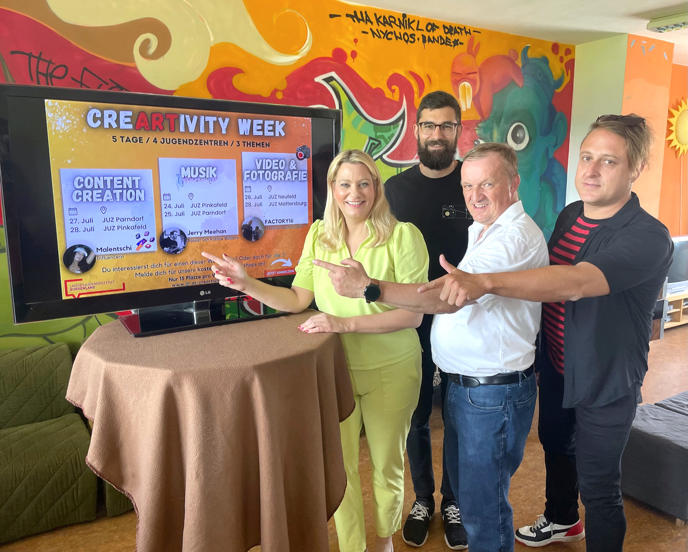 6, 5, 4, 3, … 6 kostenlose Workshops an 5 Tagen in 4 Jugendzentren zu 3 interessanten Themen, das sind die Eckdaten für das Kreativprogramm während der Sommerferien des Landesjugendreferates des Burgenlandes. Der Countdown für die „creARTivity-week“ läuft und das Anmeldefenster wurde geöffnet. In der Zeit vom 24. bis zum 28. Juli 2023 finden unter diesem Titel sechs Workshops mit drei Themenschwerpunkten, verteilt auf vier Jugendzentren im Burgenland, statt. Neben Parndorf, Mattersburg und Pinkafeld ist das JUZ in Neufeld einer der vier Standorte, an denen Jugendlichen die Themenschwerpunkte in Workshops von einem Experten/einer Expertin nähergebracht werden. Landesrätin Winkler stellte mit Bürgermeister Michael Lampel und den Kooperationspartnern im Rahmen eines Pressetermins die Initiative näher vor.