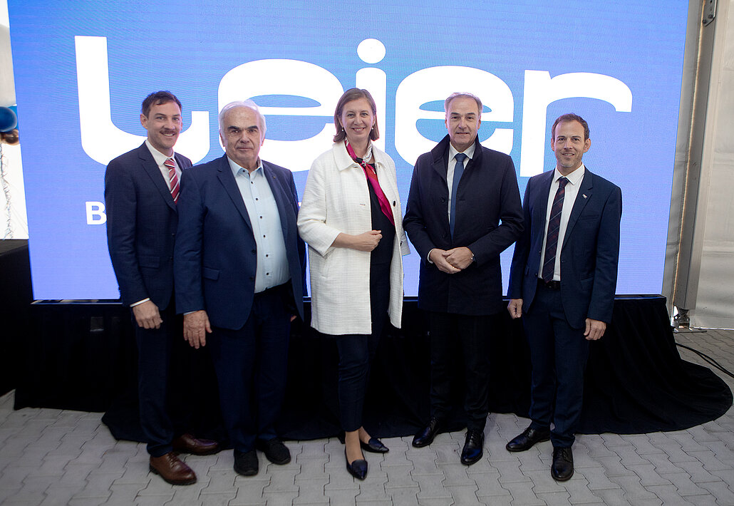 Wirtschafts-Landesrat Dr. Leonhard Schneemann, Matthias Ebner, Thomas Ebner, Unternehmensgründer Kommerzialrat Michael Leier, Staatssekretärin MMAg.a Barbara Eibinger-Miedl und Norbert Hofer (v.l.).
