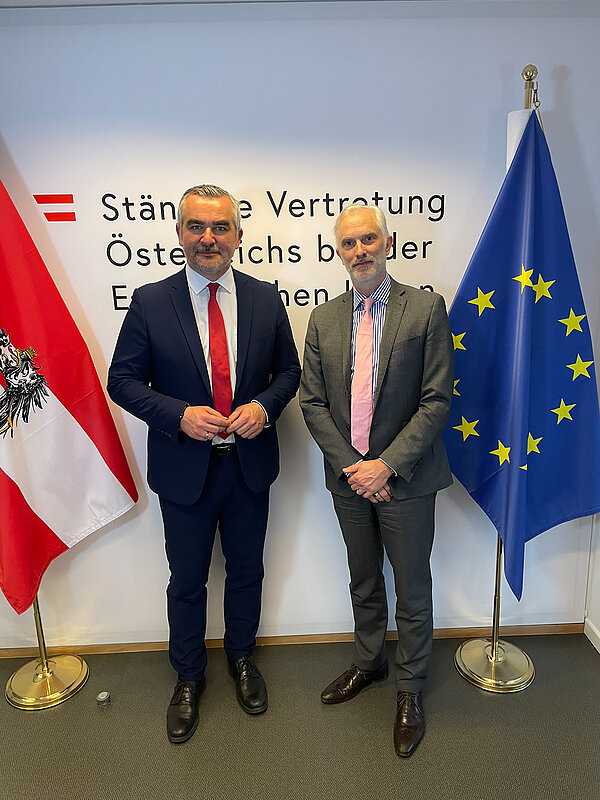 Landesrat Heinrich Dorner im Gespräch mit dem Ständigen Vertreter Österreichs in der EU, Gregor Schusterschitz.