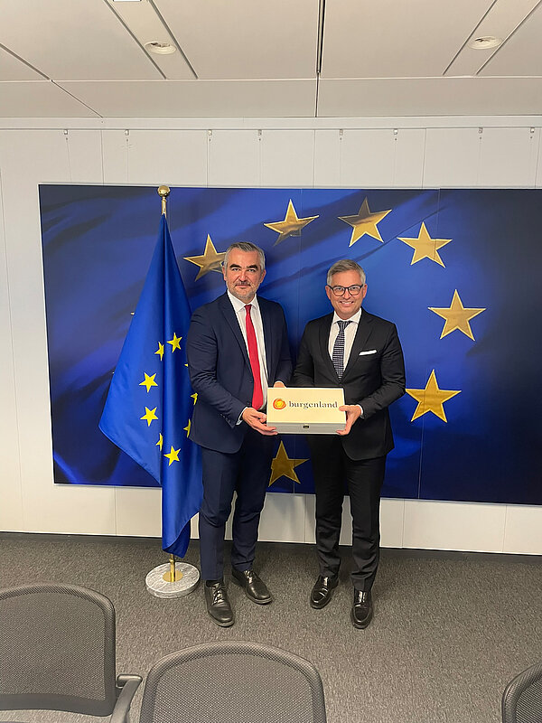 Bildtext Brüssel-Besuch EU 3: EU-Kommissar Magnus Brunner bekam von LR Heinrich Dorner besten burgenländischen Wein überreicht.