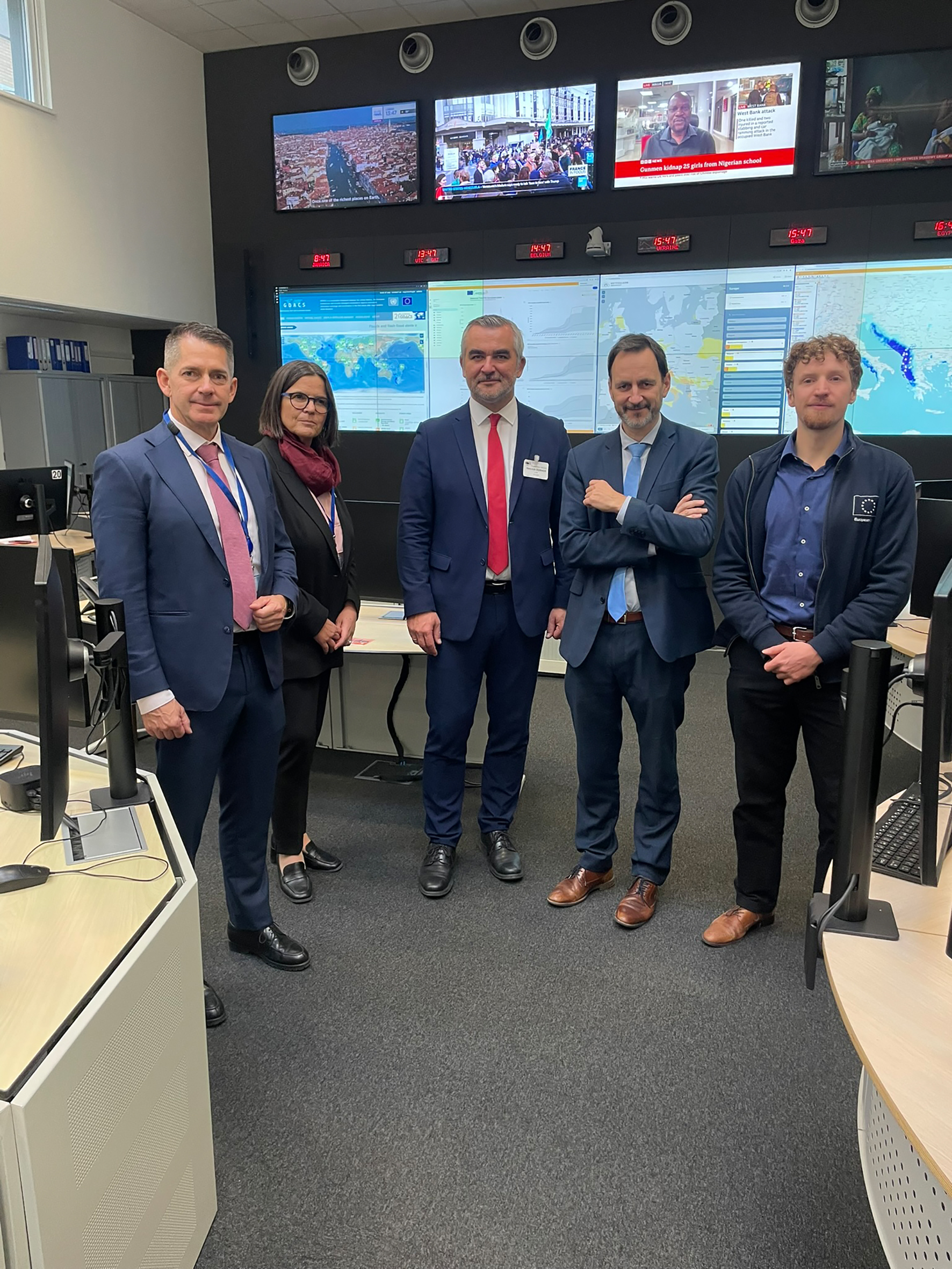 Im Zentrum für die Koordination von Notfallmaßnahmen (ERCC) tauschte sich Landsrat Heinrich Dorner (Bildmitte) mit dem Leiter der Einheit Katastrophenschutzpolitik in der Generaldirektion, Hans Ulrich Goessl (2.v.r.), über die neuesten technischen Entwicklungen und Standards im Bereich des Katastrophenschutzes aus.