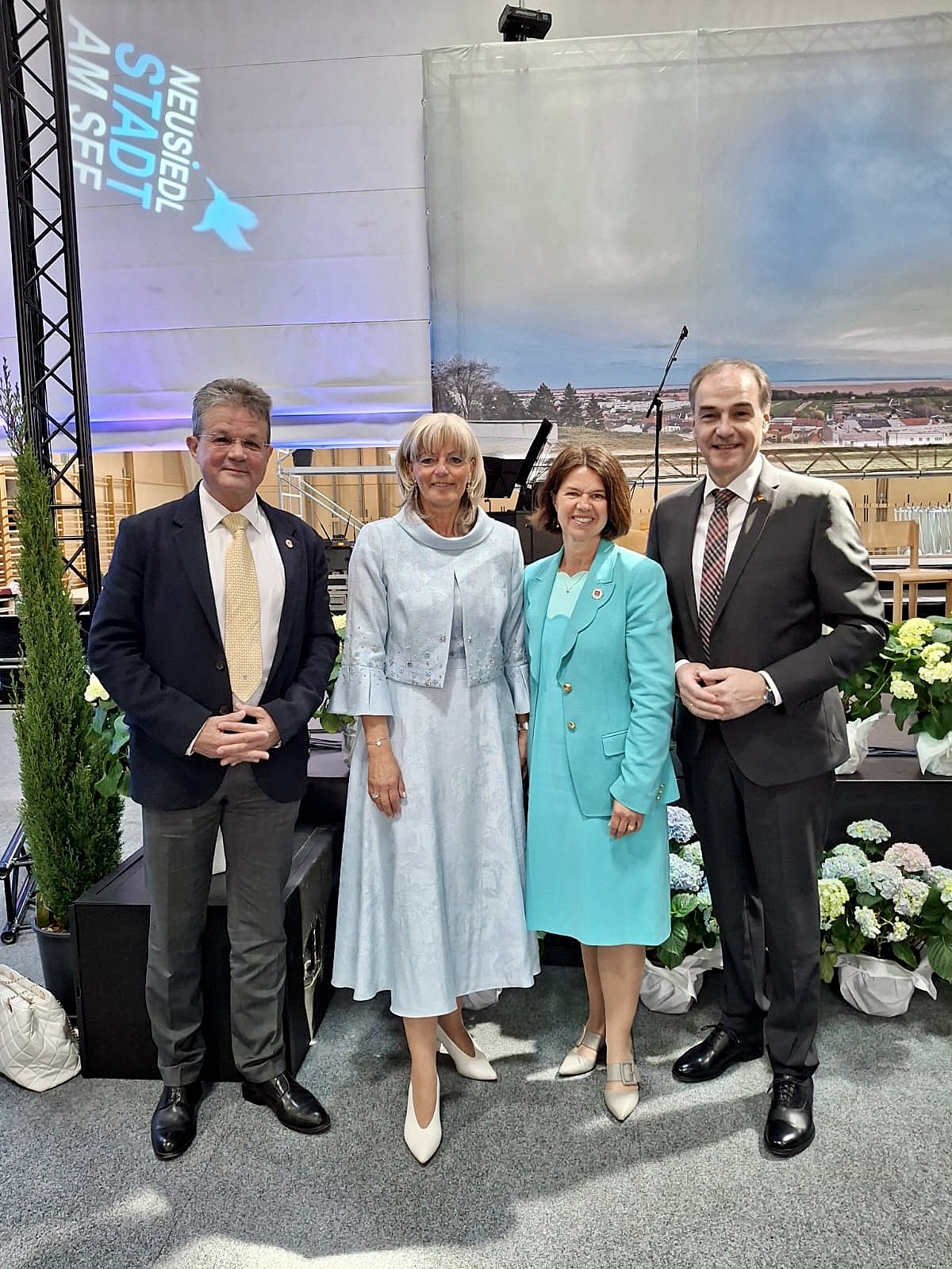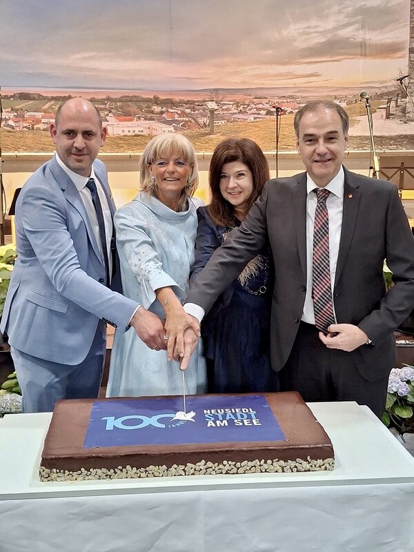 Feierliche Stimmung beim Jubiläum „100 Jahre Stadt Neusiedl am See“: Vertreterinnen und Vertreter aus Politik und Gesellschaft würdigten gemeinsam mit Markus Bohrer, Bürgermeisterin Elisabeth Böhm, Gemeinderätin Michaela Kogler-Bohrer und Landesrat Leonhard Schneemann die erfolgreiche Entwicklung der Stadt.