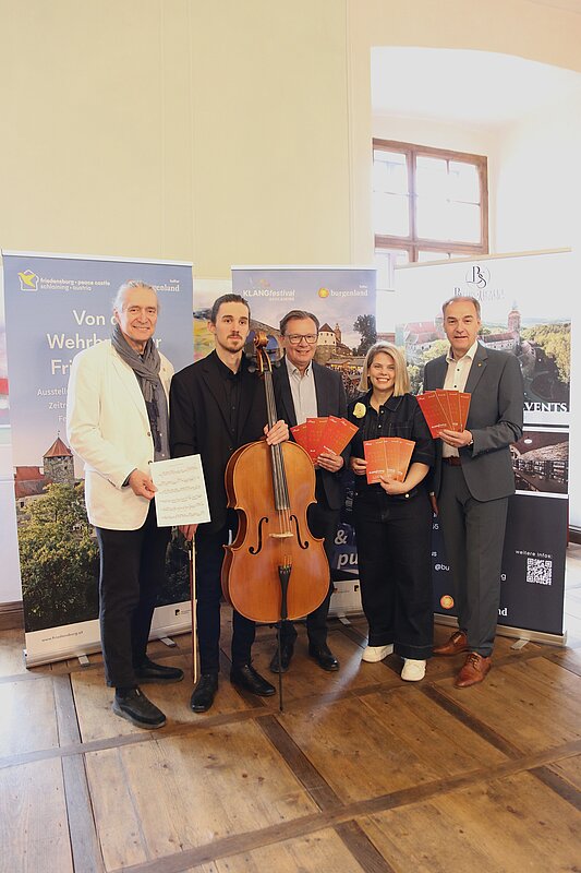 Klangfrühling_02: Gerhard Krammer, Intendant KLANGfestival Schlaining, Damjan Stuller (Violoncello), Norbert Darabos, Standortleiter Burg Schlaining, Claudia Priber, KBB Geschäftsführerin, Landesrat Leonhard Schneemann