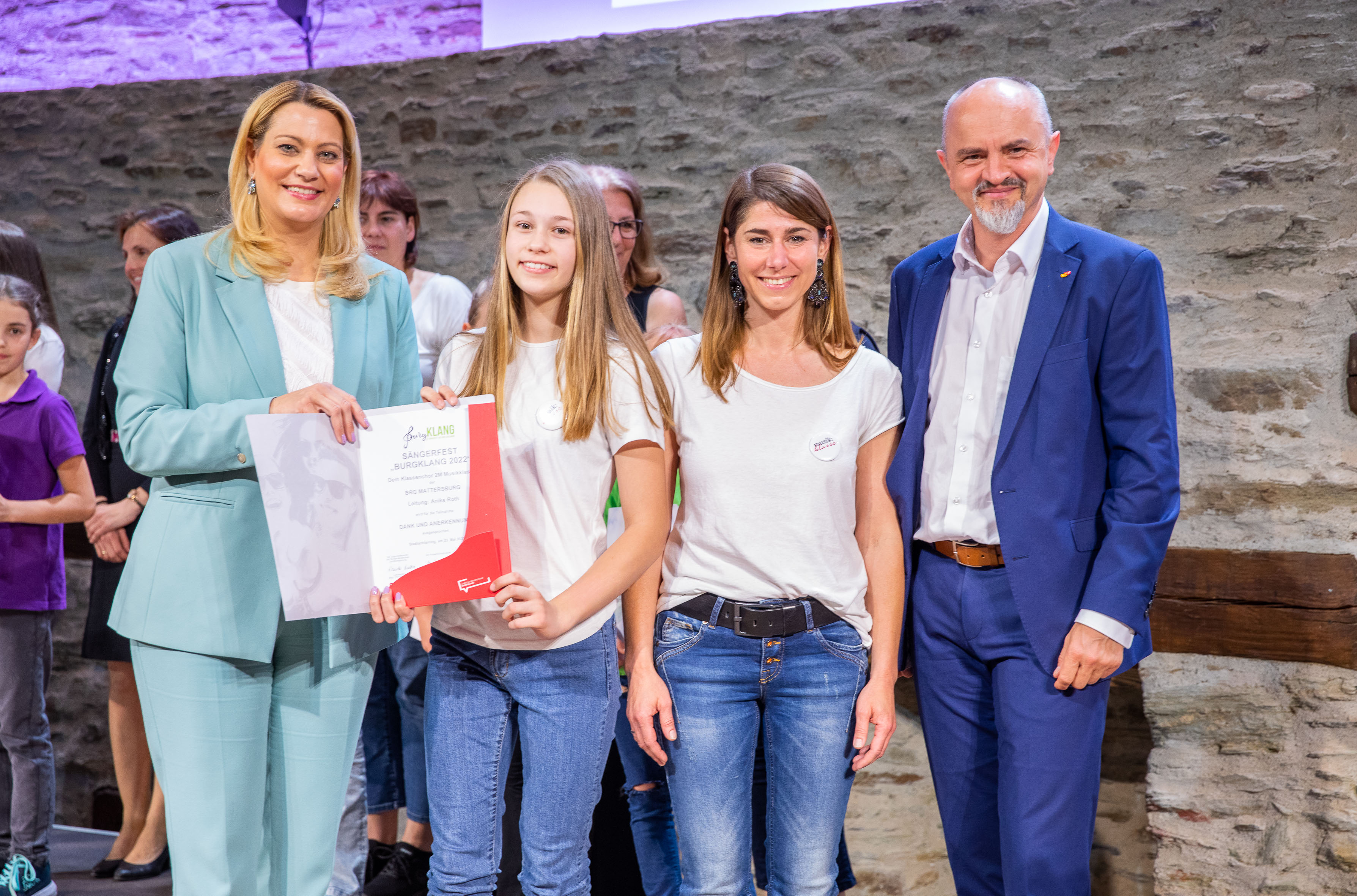 Das Sängerfest BurgKLANG ganz auf burgenländische Jugendchöre ausgerichtet fand heute, 23. Mai 2022, auf Burg Schlaining statt. 10 Chören aus Volksschulen, Mittelschulen und Gymnasien wurden heute durch Bildungslandesrätin Daniela Winkler, im Beisein von Bildungsdirektor Heinz Josef Zitz und Intendant Mag. Gerhard Krammer, Urkunden für deren Darbietungen überreicht. „Es freut mich besonders heute den Schülerinnen und Schülern beim gemeinsamen Musizieren und Singen zu zuhören und ihnen in Form einer Urkunde Dank und Anerkennung für die vorgebrachten Darbietungen zu zeigen. Nach langer Zeit der verstummten Musiksäle sind es Veranstaltungen wie heute die uns wieder Energie tanken lassen“, so Landesrätin Winkler.