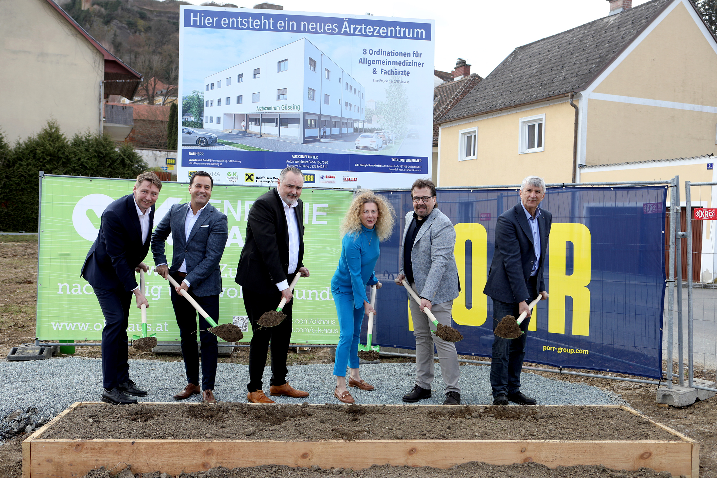 Die burgenländische Gesundheitsoffensive wird auch im Raum Güssing vorangetrieben, viele Impulse zur Absicherung einer breiten medizinischen Versorgung wurden seitens des Landes bereits gesetzt. Das Leistungsspektrum der Klinik Güssing wird stetig erweitert, zudem wurde erst vergangenes Jahr die vakante gynäkologische Facharztstelle im neuen Ambulatorium „Frauengesundheit Burgenland“ neu besetzt. „Wir bauen wohnortnahe Spitzenmedizin für die Burgenländerinnen und Burgenländer konsequent aus. Unser Ziel ist es, die beste Gesundheitsversorgung zu etablieren und gleichzeitig einer Zwei-Klassen-Medizin entgegenzuwirken“, so Landeshauptmann Hans Peter Doskozil. Nun entsteht in Güssing unter dem Bauherrn Anton Weinhofer ein modernes Ärztezentrum, das die Verfügbarkeit medizinischer Dienste mit Kassenverträgen in der Region weiter verbessern soll. Heute, Mittwoch, lud die Bauherren-Familie Weinhofer zum Spatenstich, der im Beisein von Landeshauptmann Hans Peter Doskozil, Bürgermeister Vinzenz Knor, Ärztekammer-Präsident Dr. Christian Toth, Michael Oberfeichtner, Geschäftsführer der bauausführenden Firma O.K. Energie Haus GmbH, und Volkshilfe-Präsidentin Verena Dunst vorgenommen wurde. Fünf der geplanten acht Ordinationen im neuen Ärztezentrum sind bereits fix vergeben – alle an Ärztinnen und Ärzte mit Kassenvertrag. Darunter wird auch eine seit drei Jahren vakante Kassenstelle mit einer Allgemeinmedizinerin besetzt, freute sich LH Doskozil und betonte: „Die umfassende ärztliche Versorgung auf Kasse – mit möglichst kurzen Wegen vor Ort – ist das Ziel unserer Offensivstrategie im Gesundheitsbereich. Jedes zusätzliche Angebot ist dabei sehr willkommen. Nach Fertigstellung des neuen Ärztezentrums in Güssing werden unterschiedliche medizinische Dienste mit Kassenverträgen unter einem Dach angeboten, ich gratuliere Familie Weinhofer zu diesem Projekt.“ Bereits im Herbst soll das neue Ärztezentrum teilweise in Betrieb gehen.