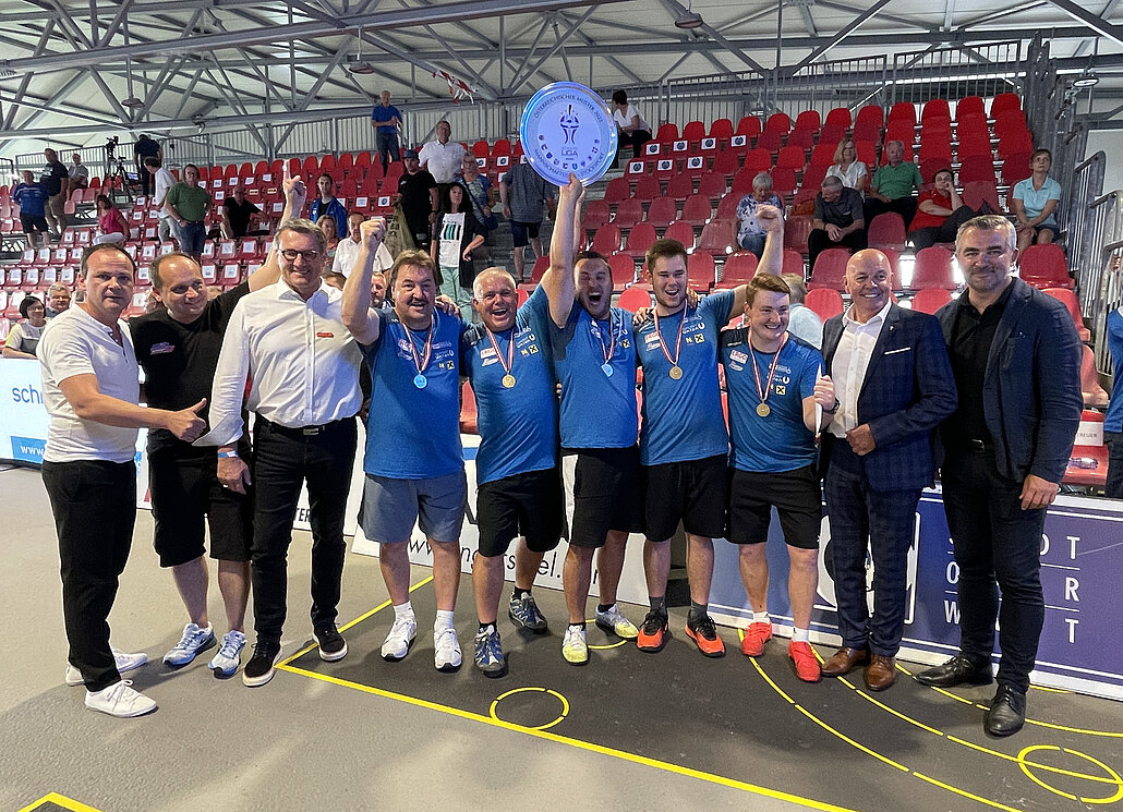 Bildtext Staatsliga-Finale Oberwart-Herren: Sport-Landesrat Mag. Heinrich Dorner (r.) gratulierte gemeinsam mit Bürgermeister Landtagsabgeordneter Georg Rosner (2.v.r.), ESV Oberwart-Obmann Christian Resch (l.), Stadtrat Mario Raba (2.v.l.) und ASKÖ Burgenland-Präsident Dr. Alfred Kollar (3.v.l.) der Staatsliga-Meistermannschaft des ESV Union Wang (Mitte).