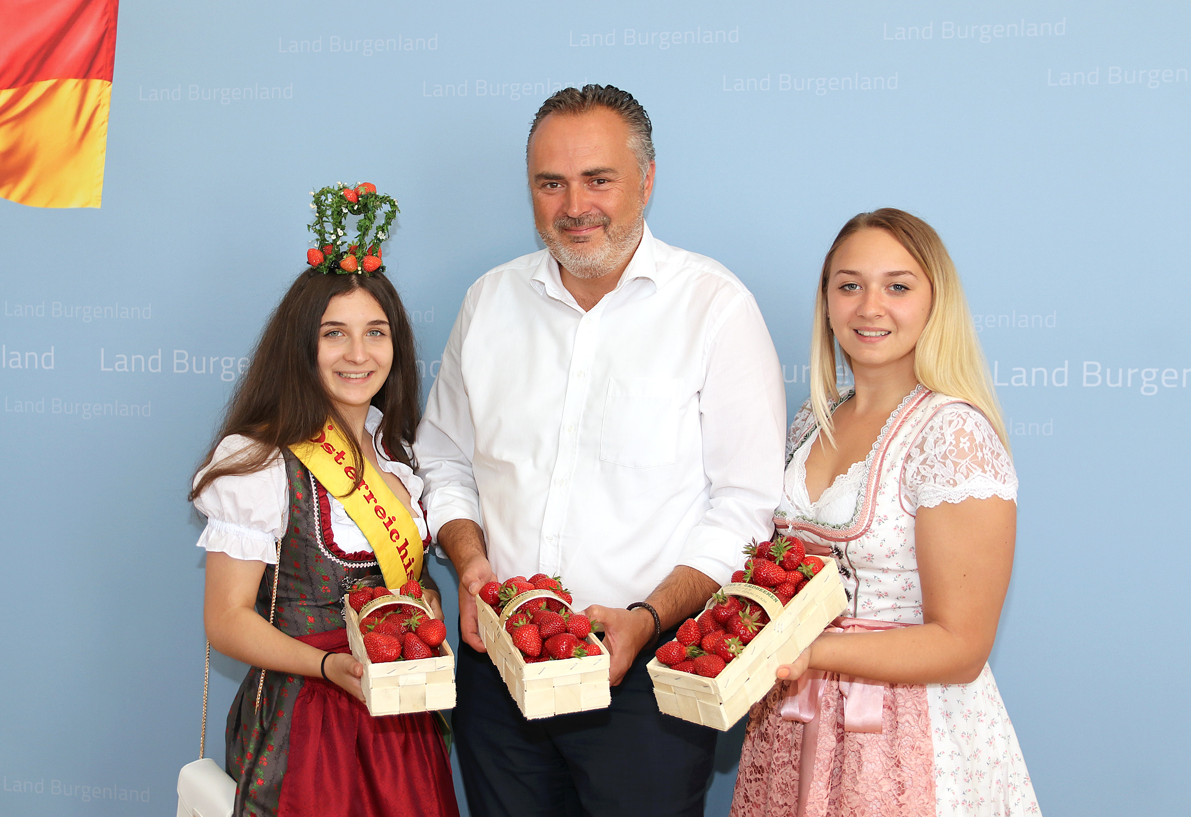 Bildtext Besuch Erdbeerkönigin_1: LH Hans Peter Doskozil mit der neuen Österreichischen Erdbeerkönigin Sophie I. (li.) und ihrer Vorgängerin Lisa I.
