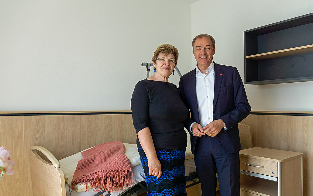 Bildtext Baustellenbesichtigung_PKZ_Zurndorf_2: Soziallandesrat Dr. Leonhard Schneemann besichtigte gemeinsam mit und Dr. Christine Ekker, MBA, MAS, der Operativen Leitung im Geschäftsbereich Pflege/Heimleitung des Arbeitersamariterbundes auch das bereits fertig eingerichtete Musterzimmer.