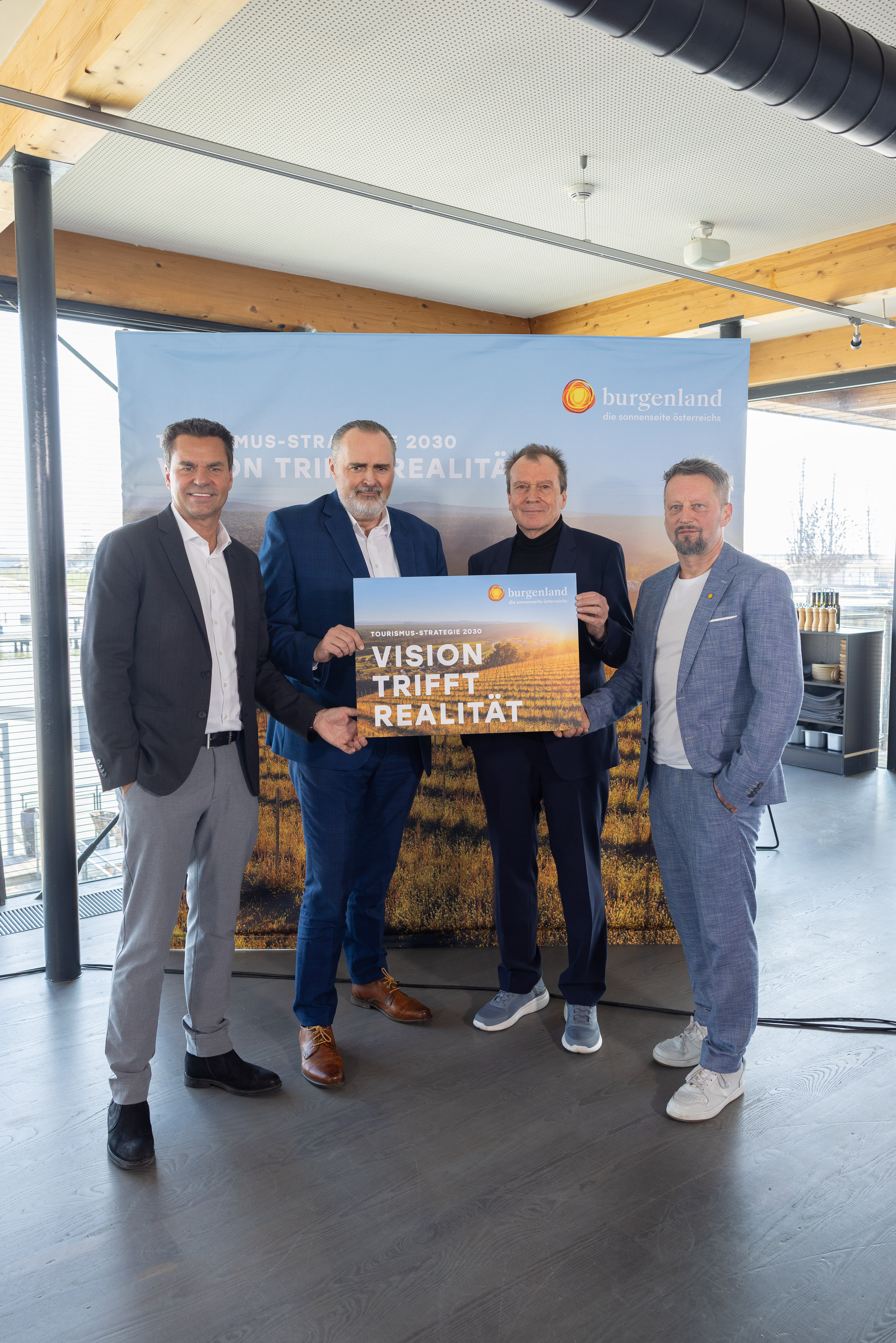 Burgenland Tourismus-Geschäftsführer Didi Tunkel, Landeshauptmann und Tourismusreferent Hans Peter Doskozil, Zukunftsforscher und Tourismusexperte Andreas Reiter und Burgenland Tourismus-CMO Kurt Kaiser (v.l.) beim Presse-Talk.