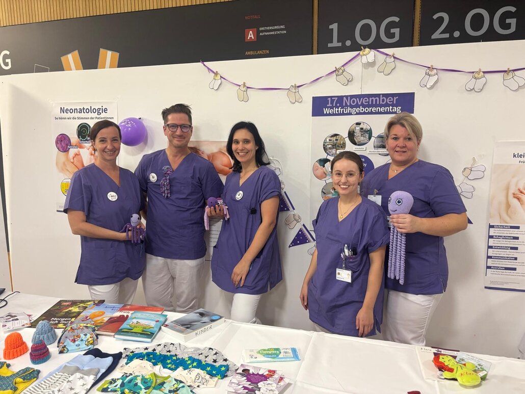 Passend zum Anlass erstrahlte der Eingangsbereich der Klinik in leuchtendem Lila, das weltweit als Symbolfarbe für Frühgeborene gilt. Diese Farbe steht für Hoffnung, Einzigartigkeit, Ermutigung, Sensibilität und die Offenheit, anderen zu helfen – Werte, mit besonderer Bedeutung für die kleinen Patient*innen und ihren Familien auf ihrem oft herausfordernden Weg zur Seite stehen. „Jedes Frühchen ist ein kleines Wunder – und der Welt-Frühgeborenen-Tag erinnert uns einmal mehr daran, warum unsere Arbeit so wichtig ist. Es war schön zu sehen, wie groß das Interesse an unserer Arbeit ist. Der Besuch ehemaliger Patientinnen und Patienten, der Austausch mit deren Familien, sowie mit den Besucherinnen und Besuchern hat uns sehr berührt,“ sagt DGKP (KJP) Brigitte Wagner, Stationsleiterin der Abteilung für Kinder- und Jugendheilkunde mit Neonatologie der Klinik Oberwart.