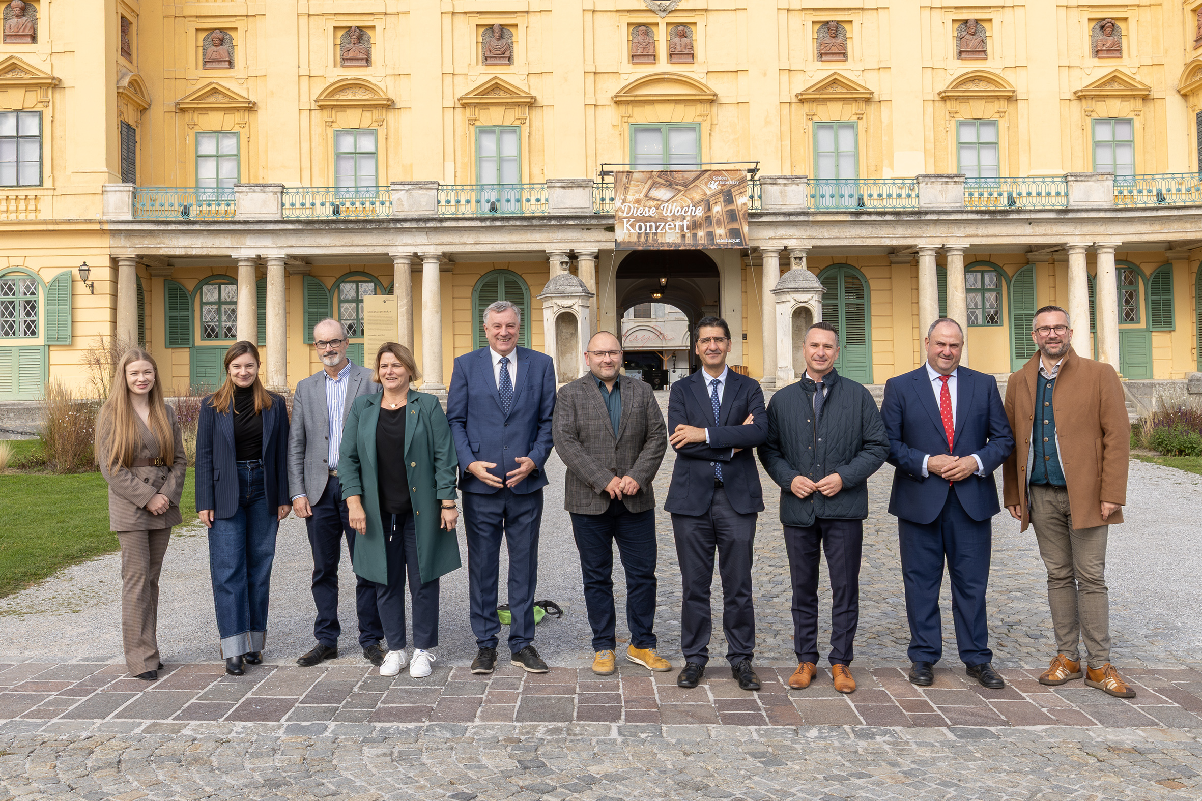 Bildtext WINE Intergroup 1: LAbg. Robert Hergovich (3.v.r.), Präsident der WINE Intergroup und Mitglieder der WINE Intergroup vor Schloss Esterhazy in Eisenstadt.