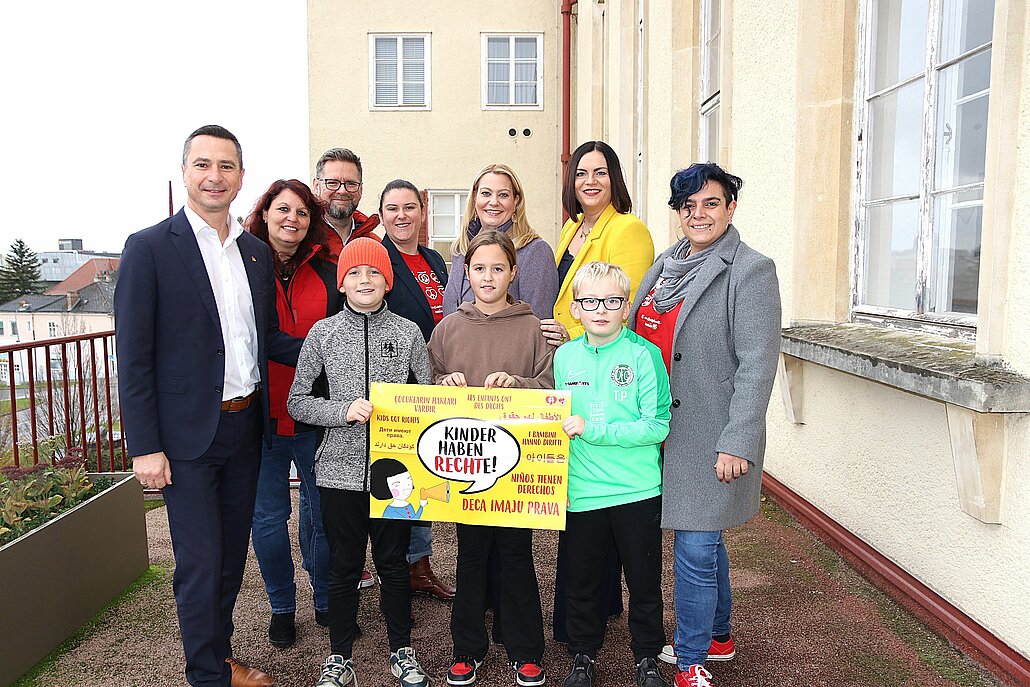 Bildtext Kinderrechte_1: LH-Stv. Astrid Eisenkopf, Landesrätin Daniela Winkler und Landtagspräsident Robert Hergovich mit den Vertretern der Kinderfreunde Burgenland und den Schülerinnen und Schülern.
