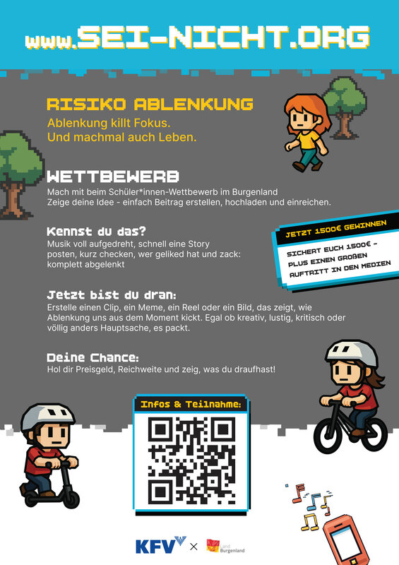 Kreativität ist gefragt, um auf Ablenkung im Straßenverkehr aufmerksam zu machen. Der Einsatz für mehr Verkehrssicherheit und die Teilnahme an der Kampagne zahlen sich aus. Neben Geldpreisen für alle Stockerlplätze und einem Publikumspreis wird die Gewinneridee zusätzlich mit professioneller Unterstützung als Social Media-Kampagne im Burgenland umgesetzt.
